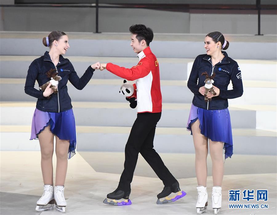 1月15日,中国花样滑冰选手金博洋(中)与芬兰运动员交流。 当日,“2019中芬冬季运动年”开幕式在北京首钢冰球馆举行。